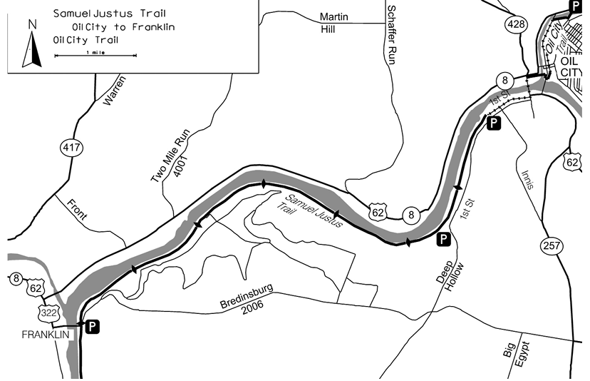 The Samuel Justus Trail connects Oil City to Franklin, on the eastern side of the Allegheny River in Cranberry Township. This is a remote rail-trail, with the river on one side of the trail and hillside with occasional farm on the other. This trail is part of the Erie to Pittsburgh Trail (page NE-16).