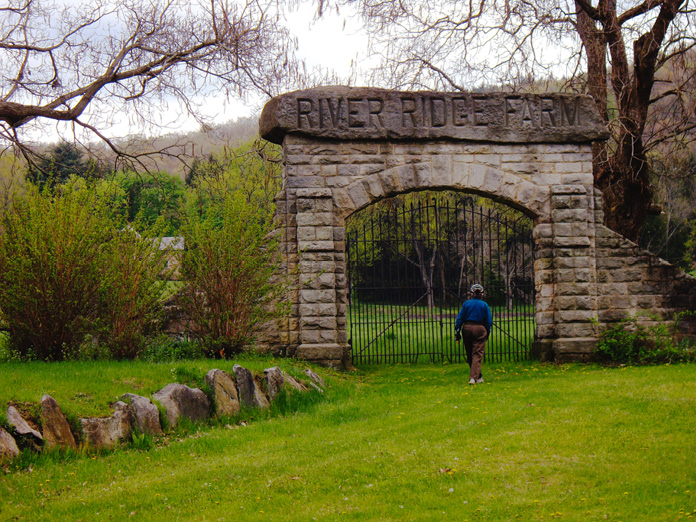 The most prominent feature of this trail is River Ridge Farm at MP124.5. This impressive mansion was built in 1913 by Joseph C. Sibley, who developed a formula for refining crude oil for use in railroad engines (Galena Oil) and later served five terms in the US House of Representatives. The estate originally included 21 other buildings, including a stone campanile near the river. This bell tower still stands, but the eleven bells have been removed. The entrance gate, with “River Ridge Farm” carved across the top, still stands near where a railroad siding served the estate. The estate is now (2018) partly farmland and posted against entry.