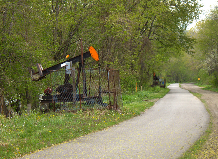 Oil City Wastewater Treatment Plant (northern) trailhead: At the end of the US322 bridge turn left/north on Bredinsburg Rd. Go 4.7 miles and turn left/north on Deep Hallow Rd. Go 1.5 miles (the street name becomes First St) to the trail turnoff, which is marked “Samuel Justus Trail” and “Wastewater Treatment Plant” (this is just across from the entrance to Venango Campus of Clarion College). Turn left/west and follow the road along the sewage plant to park near the trailhead. This parking lot is also the southern trailhead for the Oil City Trail (page NE-75).